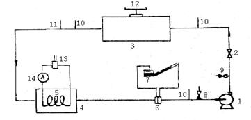 1 通风机 2蝶阀 3 干燥箱 4 加热器 5 电热装置 6 孔板流量计 7压差计